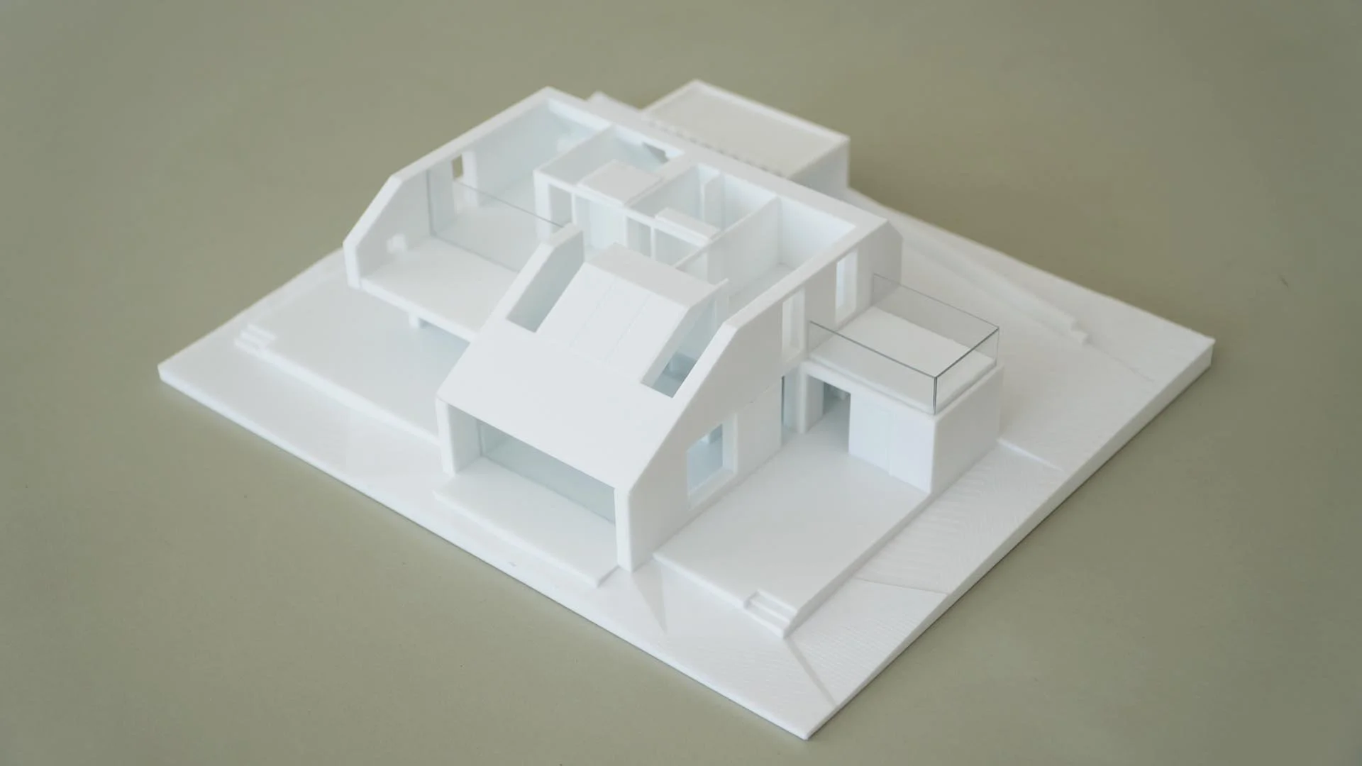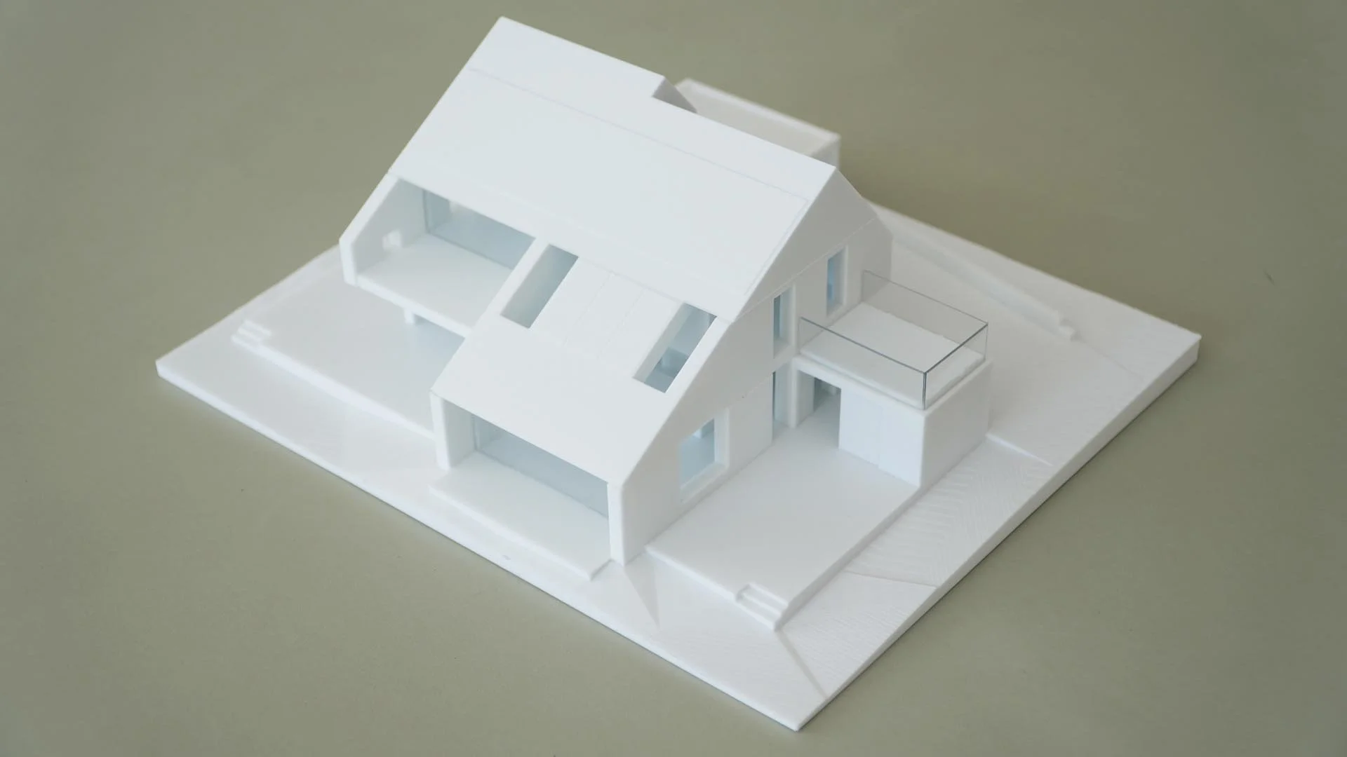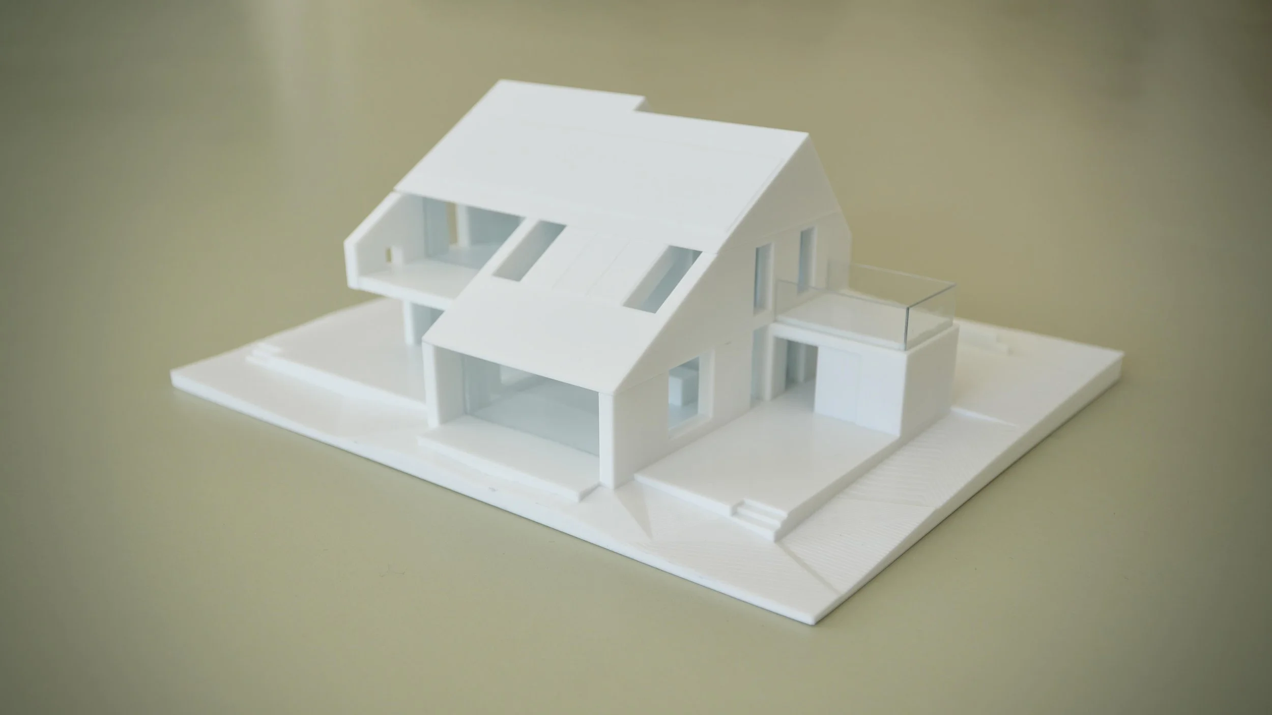 Vi printede VELUX-projektet i 1:200, hvor der var plads til også at have en smule terræn med omkring bygningen og lidt af naboens hus. I denne skala er det begrænset, hvor mange detaljer på bygningskroppens udformning, man kan have med, men alligevel giver modellen et vildt godt indtryk af projektet. – Især for uprofessionelle bygherrer og kommende brugere, der ikke er eksperter i at afkode 2D-tegninger, og hvor fotorealistiske visualiseringer kun giver et billede af projektet fra ganske få synsvinkler.